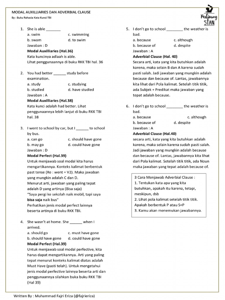 You shall have a motorbike. I shall leave for america tomorrow. Mengandung arti "seharusnya" dalam bentuk present Hai sahabat sbi, pada kesempatan kali ini admin ingin menjelaskan kepada sahabat sbi mengenai contoh soal modal dalam bahasa inggris, sahabat sbi sudah tidak sing lagi bukan dengan apa itu modal? Jan 05, 2019 · posted in excercise tagged all about modals, contoh kalimat auxiliary verb, contoh kalimat modal bahasa inggris, contoh kalimat modal dalam bahasa inggris, contoh kalimat modals aktif dan pasif, contoh percakapan modal auxiliaries, contoh soal auxiliary dan jawabannya, contoh soal essay modal auxiliary, contoh soal latihan modal, contoh soal. Jan 23, 2019 · modal memiliki beberapa jenis, diantaranya adalah can, could, will dan would. Berikut contoh soal present perfect tense. Contoh soal modal auxiliary verb dan jawabannya: You … throw litter from your vehicle because it can pose a risk to the environment. Untuk melatih pemahaman mengenai materi modals can, could, will dan would, berikut beberapa soal latihan tentang modals can, could, will dan would. Inilah contoh soal pilihan ganda bahasa inggris tentang modal beserta jawabannya: Aug 14, 2020 · 1. Bentuk lampau dari shall, jika berada pada anak kalimat;