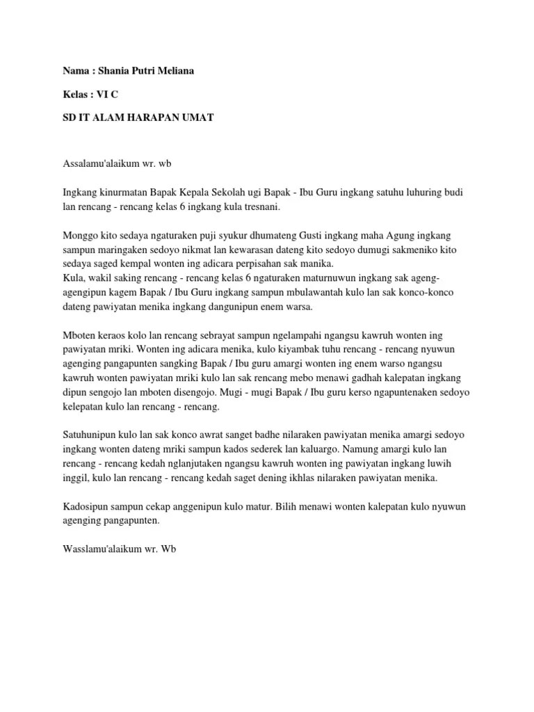Pidato bahasa jawa bisa disampaikan pada acara ulang tahun dan . Sumber data penelitian ini adalah siswa kelas vi sd negeri 1 suruh kabupaten trenggalek tahun pelajaran 2013/2014. Contoh pidato bahasa jawa atau sesorah ulang tahun sekolah; Acara perpisahan seperti kelulusan, wisuda, dan perpisahan kantor menjadi momen yang mengharukan. Bikin teks pidato dalam bahasa jawa itu lebih rumit dibandingin bahasa indonesia. Itu saya persembahkan pidato unggah unggahan kelas bahasa jawa pada. Semoga contoh teks naskah pidato perpisahan sekolah menggunakan bahasa jawa diatas dapat sedikit membantu dalam mengerjakan tugas sekolah dan bermanfaat bagi . Secara khusus, kami ingin mengucapkan terima kasih kepada bapak kepala sekolah dan para guru yang telah mengajar kami selama sekitar enam tahun. Pada kegiatan formal, perpisahan biasanya . Contoh pidato bahasa jawa atau sesorah kelulusan sekolah; Artikulasi adalah bagaimana cara untuk melafalkan bunyi bahasa . Buatkan pidato bahasa daerah atau jawa tentang kelulusan sdjangan nyonto. Terlebih lagi, kalo kalian nggak fasih dalam berbahasa jawa.